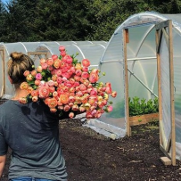 Sunflowers, Delphiniums, over 25 different varieties of Dahlias. Our farm is unique in that it has several micro-climates giving us the creativity to grow a wonderful variety of flowers. The assortment is rounded out with Astrantia, Ranunculus and Lavender.